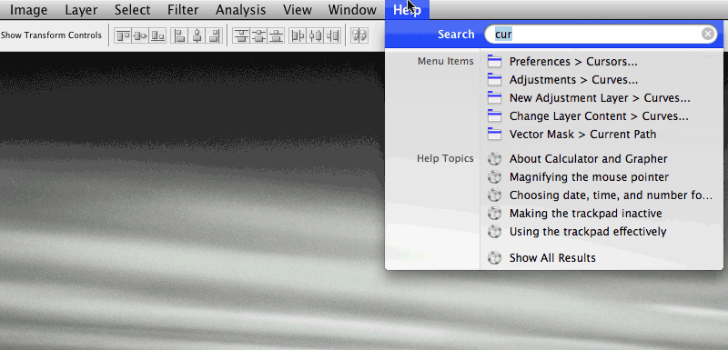That’s why I’m intrigued by Leopard’s Spotlight-style searching of application menus (a weirdly unheralded feature, I think). As you type, related terms pop up, and as you arrow through the list of results, Leopard highlights the results. Here’s an animated screenshot of the feature running in Photoshop.