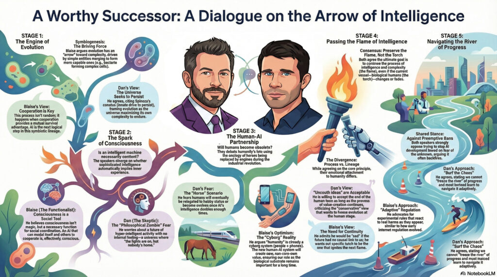 The ever thoughtful Blaise Agüera y Arcas (CTO of Technology & Society at Google) recently sat down for a conversation with the similarly deep-thinking Dan Faggella. I love that I was able to get Gemini to render a high-level view of the talk: