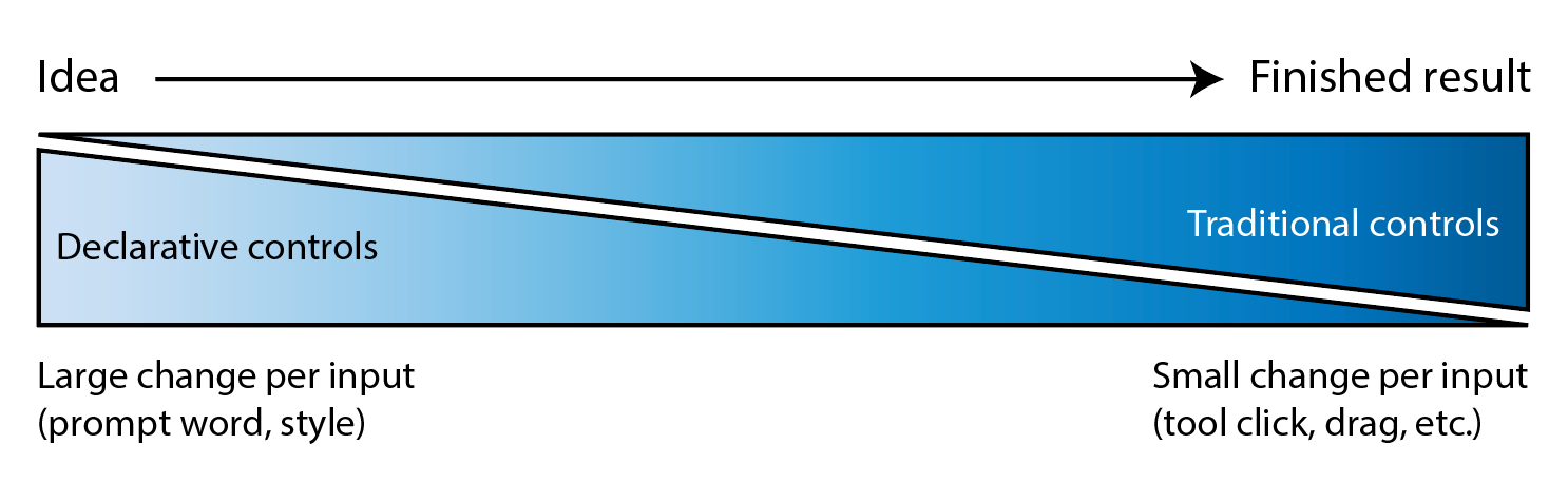 I’ve long quoted James Ratliff, the super sharp designer behind Adobe’s Project Graph (who’s recently decamped to Figma), in nicely phrasing how the process of generating & refining ideas generally starts broad/declarative (searching, prompting) and moves towards fine-grained methods (selecting, moving, etc.):