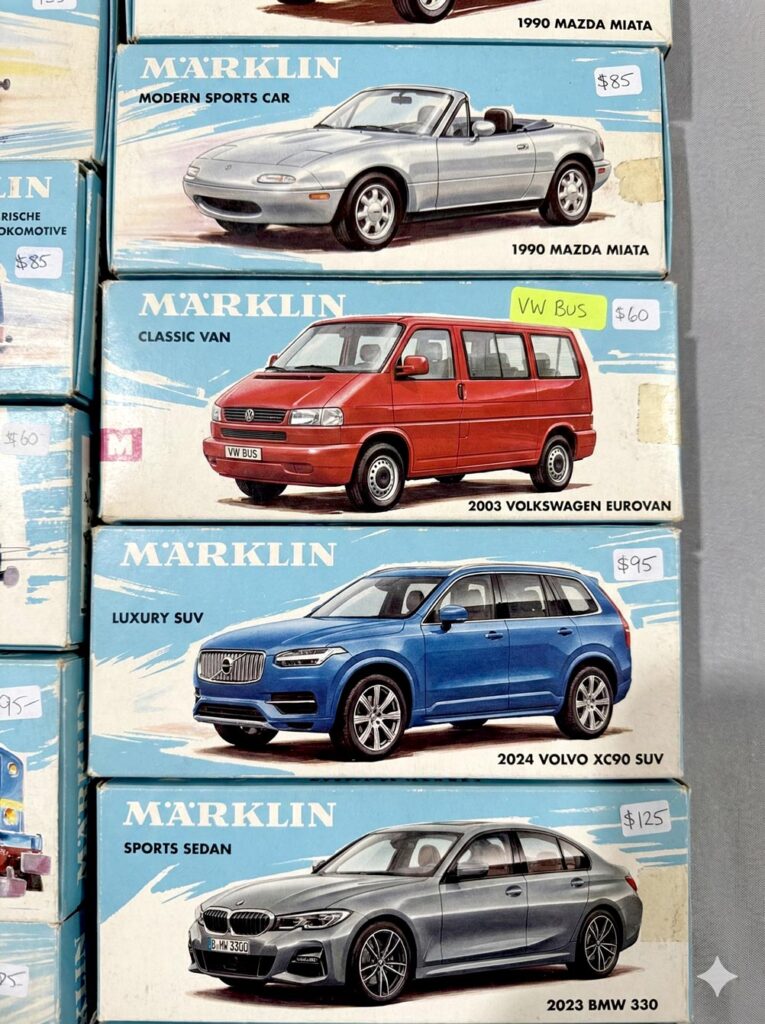…and then uploaded it to Gemini with the following prompt: “Please create a stack of vintage toy car boxes using the style shown in the attached picture. The cars should be a silver 1990 Mazda Miata, a red 2003 Volkswagen Eurovan, a blue 2024 Volvo XC90, and a gray 2023 BMW 330.” And boom, head shot, here’s what it made: