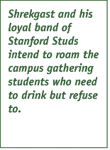 Shrekgast and his loyal band of Stanford Studs intend to roam the campus, especially the coffee shops, chapels and libraries, gathering students who need to drink but refuse to.
