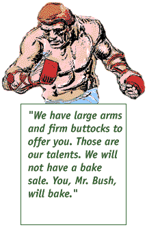 "We are, for the most part, athletic, resilient young men. We have large arms and firm buttocks to offer you. Those are our talents. We will not have a bake sale. You, Mr. Bush, will bake. What more does Mr. Bush ask from us?" asked Seamus K. Murphy, rhetorically.
