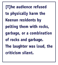 Perhaps just as disturbing as the actual jokes was the fact that the audience refused to physically harm the Keenan residents by pelting them with rocks, garbage, or a combination of rocks and garbage. The laughter was loud, the criticism silent.