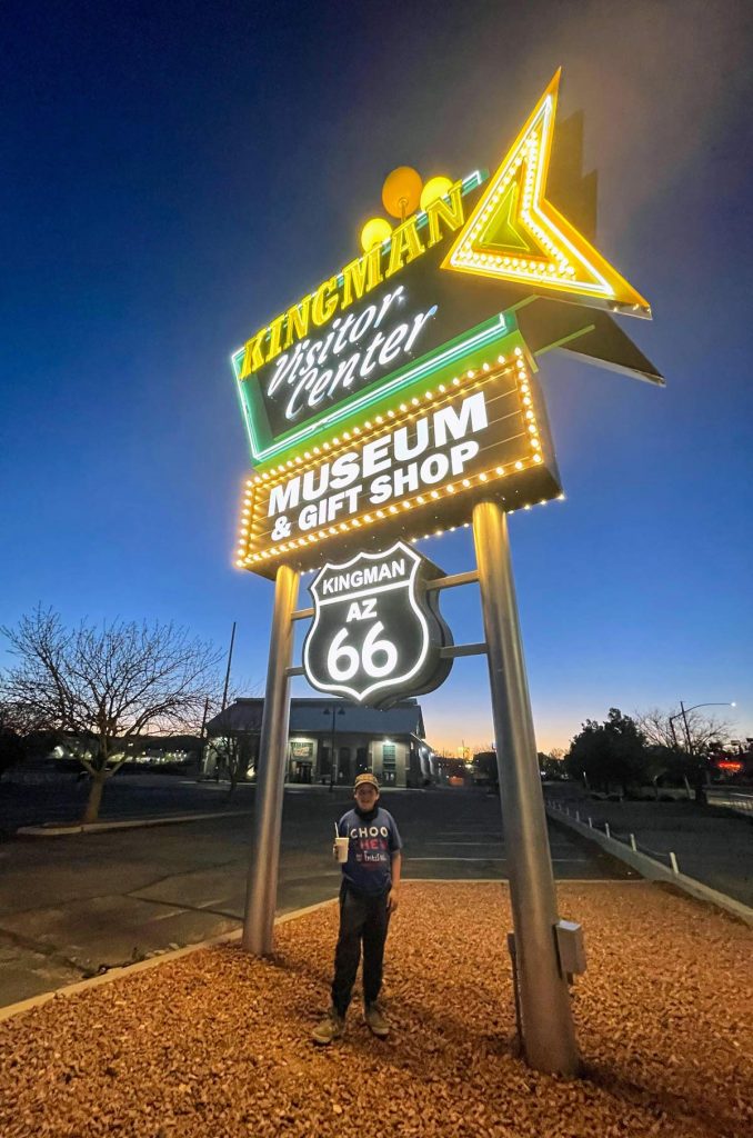 When entering Kingman, we were following an intermodal train. Next, we went to Mr. D’z, a wonderful 50’s diner. Next, we went to see their big Santa Fe 4-8-4 steam locomotive, #3759, and some old cars all along Route 66. Across 66 was the visitors center (the ex power plant) and the train lines. It was almost completely dark, so their cool neon sign lit up.