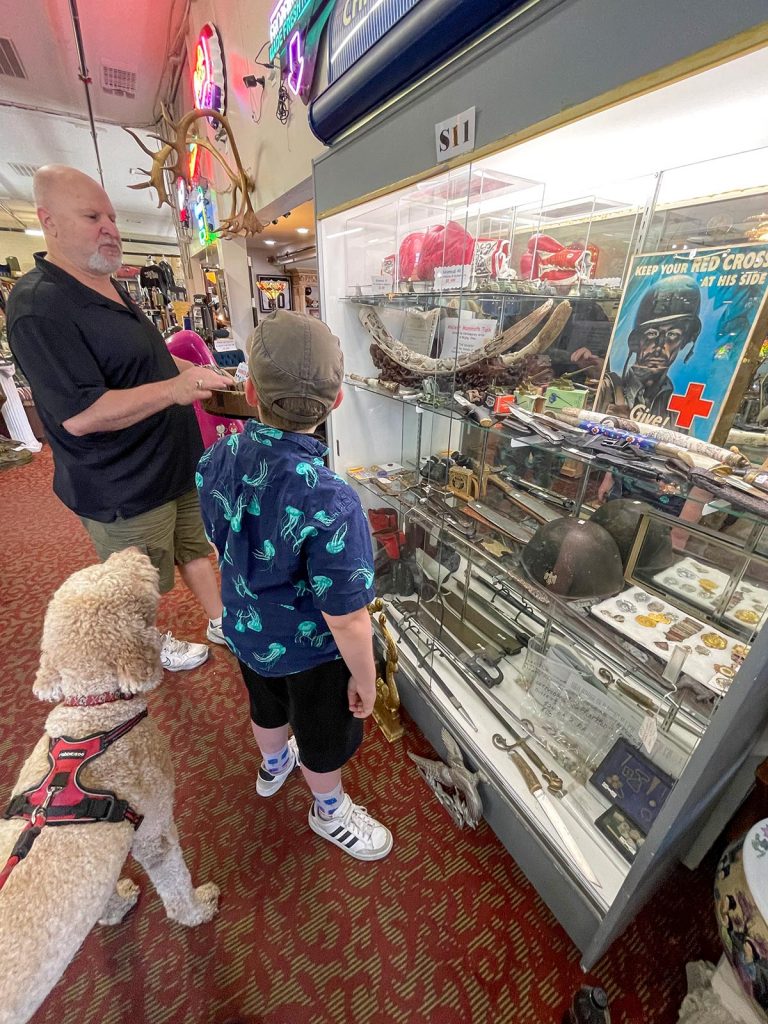 While Mom & Finn took in the amazing Meow Wolf exhibition (more on that below), Henry and I took El Poocho on a little antiques exploration of the arts district. Hen in particular was thrilled to drop in on the shop featured in the Pawn Stars TV show. He says “I saw some Confederate paper bills & even some Picassos!”