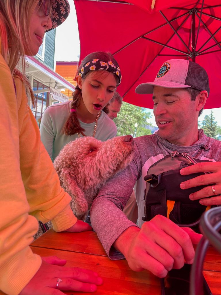We woke up, packed up, and hit the road. When we got back to Crested Butte, we got some breakfast and walked around. Finn kept stealing my hat, and he almost threw it in a river!